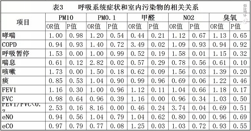 表3中,FEV1/FVC和空气中的PM0.1的关系非常明显(OR值=8.16),而且和NO2的关系也是比较明显的(OR=3.74)。呼吸阻塞的指标为FEV1/FVC