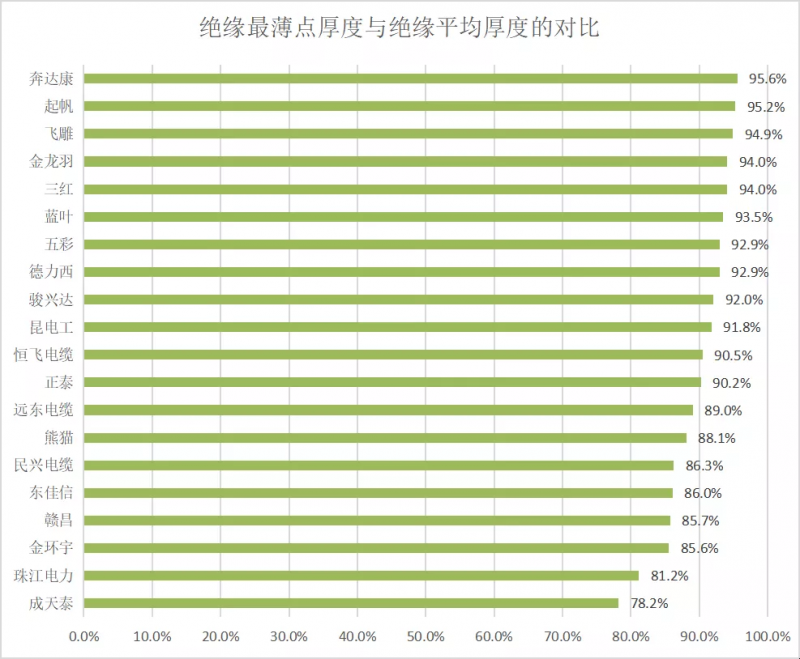 三、电线绝缘材料厚度越均匀,越能保证产品质量。本次测评中,奔达康、起帆和飞雕电线样品的绝缘最薄点厚度与绝缘平均厚度最接近,用料均匀,表现较好。