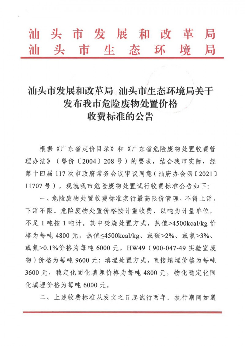 北极星固废网讯:广东省汕头市发展和改革局 生态环境局发布《关于发布我市危险废物处置价格收费标准的公告》,将危险废物处置试行收费标准公告如下: