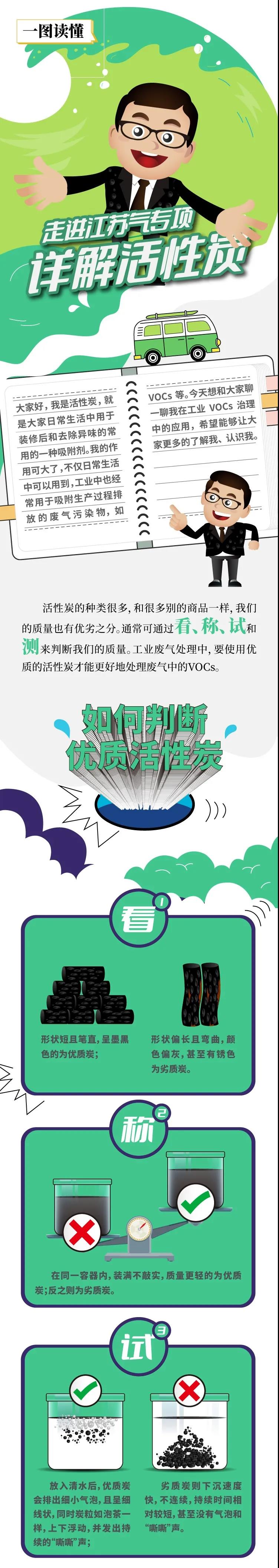 北极星VOCs在线讯:今年年初以来,江苏省生态环境厅围绕活性炭废气治理设施的规范管理,持续组织开展了一系列极具成效的工作,包括“活性炭”专项执法行动、规范活性炭产品质量(一看二称三试四测)、排污单位活性炭使用更换纳入排污许可管理,为各地生态环境部门提供了学习借鉴的经验做法。下文总结了一图读懂活性炭专题知识,让企业、用户和环保单位深入了解活性炭吸附VOCs治理工艺。如下: