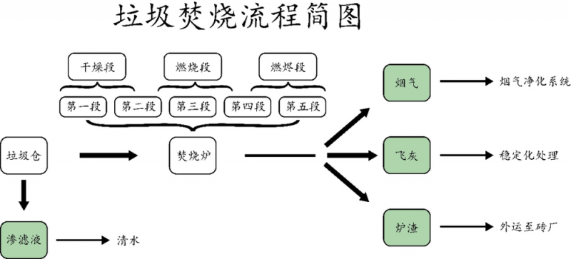 在焚烧发电厂,厨余垃圾和其他垃圾在发酵过程中产生的渗滤液会被收集,净化处理后成为焚烧过程中的“冷却剂”。随后垃圾进入焚烧炉,依次通过五段焚烧炉,最后排出烟气、飞灰与炉渣。它们各自进入相应的处理系统,达到排放标准后排出。而焚烧产生的炉渣则会被运至砖厂作为制砖原料。