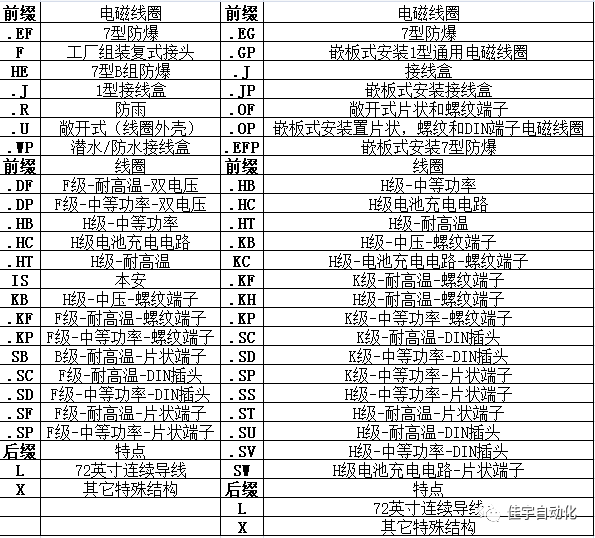 表1列举出适用于各类电磁线圈的任选电气特性,指需在型号前加上这些前缀即可得到所需特性。