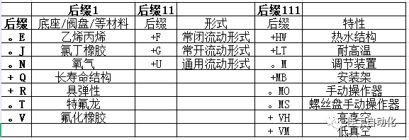 表2列出了适于各类阀门系列的任选结构特性,只需在型号后加上这些后缀即可得到所需特性。