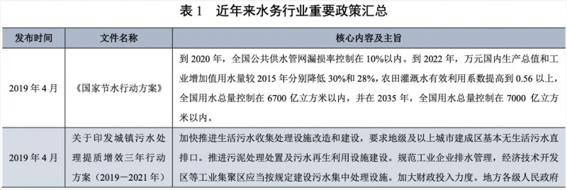 国家发改委、水利部等多部委新出台水务行业相关文件,主要通过以下三个方面确保水务行业健康、可持续发展。(一)要求实施严格的节约用水制度,控制用水总量;在《国家节水行动方案》要求下,我国将进一步实施最严格的节水制度,通过降低漏损率,提高用水效率,降低单位产能水资源使用量,并在用水总量上进行严格控制。(二)加快城镇污水设施建设,加强污水排放监测,进行污水处理收费标准改革。相关政策要求要加快推进生活污水收集处理设施改造和建设,规范工业污水集中处理设施,监测重点排污企业污水排放;并要求地方各级政府尽快将污水处理费收费标准调整到位,原则上应当补偿污水处理和污泥处理处置设施正常运营成本并合理盈利,并综合考虑企业和居民承受能力,完善差别化定价,统筹使用污水处理费与财政补贴资金,通过政府购买服务方式向水务企业支付服务费。(三)中央预算、地方财政、金融机构和社会资本方等多方参与,解决污水处理、水利设施和生态治理等项目资金需求。政策要求,对于生态保护等重点项目,可纳入中央项目储备库管理,加快中央预算执行,进一步理顺中央与地方收入划分和完善转移支付制度改革中统筹考虑地方环境治理的财政需求,建立健全常态化、稳定的中央和地方环境治理财政资金投入机制。加大财政投入力度,研究探索规范项目收益权、特许经营权等质押融资担保,鼓励金融机构为污水处理提质增效项目提供融资支持。营造良好市场环境,吸引社会资本参与设施投资、建设和运营。通过政府和社会资本合作方式,吸引社会资本参与农村生活污水治理。对补短板的社会民生等方面基础设施项目,在投资回报机制明确、收益可靠、风险可控前提下,可适当降低资本金最低比例。