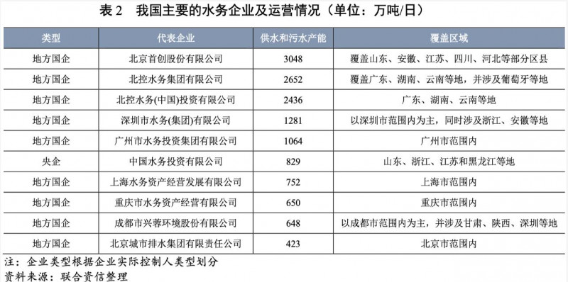 水务企业类型和竞争格局方面,目前,我国行业内分布的水务企业大致可分为三种,国有水务企业(央企和地方国企)、外商投资水务企业和民营水务企业。其中,国有地方水务企业最为普遍,多为所在地方原事业单位改制形成,其业务结构相对单一,以服务所在区域供水和污水处理为主业,区域垄断性突出,是水务行业的主力军。部分实力较强的区域(北京、深圳、成都、重庆等地)地方国有水务企业和央属水务企业基于雄厚的股东背景、资金实力和技术水平,通过并购、合资、参控股、BOT和PPP等手段在全国范围内或国外异地扩张,获取供水和污水处理业务特许经营权,并通过水务衍生行业拓展成为投资型综合水务企业,对原区域内地方水务企业产生一定竞争。外资水务企业往往拥有先进的水务技术和较高的管理水平,尤其在污水处理行业处于技术领先地位,但进入中国水务市场数量较少。民营水务企业所占市场份额较小,主要通过PPP模式在污水处理和水环境治理领域参与竞争,面临较大投资和回款压力。