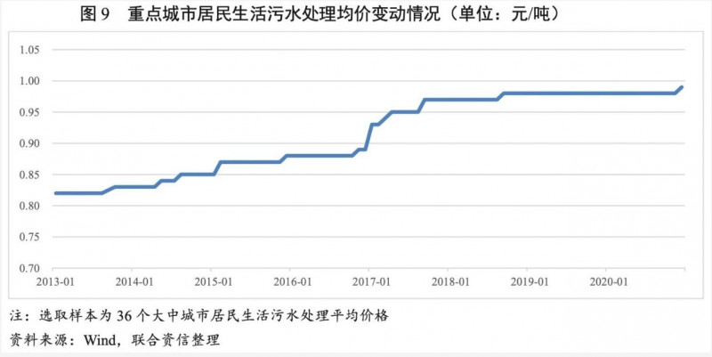 从污水处理价格来看,目前各地污水处理价格仍然由政府决定,价格整体仍然处于低位。根据国家发改委《关于制定和调整污水处理收费标准等有关问题的通知》(发改价格〔2015〕119号),污水处理收费标准要补偿污水处理和污泥处置设施的运营成本并合理盈利。城市污水处理收费标准原则上居民应不低于0.95元/吨,非居民不低于1.40元/吨。2020年,在全国省会城市和计划单列市中,太原市城区污水处理收费有所调整,居民用水污水处理收费标准由0.50元/立方米调整为0.95元/立方米,其他省会城市和计划单列市污水处理价格保持稳定。近年来,我国重点城市居民生活污水处理平均价格虽呈上升趋势,但该价格仅基本满足国家规定收费标准下限,并且居民生活污水处理费排名靠后的城市例如拉萨、海口、深圳等地,污水处理价格处于0.80元/吨~0.90元/吨,尚未满足国家规定最低收费标准0.95元/吨。整体看,污水处理价格仍处低位,部分城市尚有较大上调空间。