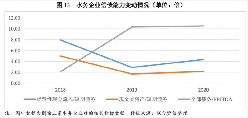 长期偿债能力方面,2018-2020年,受水务投资需求增加、盈利水平增速相对缓慢影响,水务企业全部债务/EBITDA分别为2.10倍、10.33倍和10.52倍,整体长期偿债能力较为稳定且整体偿债能力较强(2018年整体债务规模较小),预计未来行业偿债能力将继续保持稳定;因存量债务规模过大或盈利能力下滑导致的偿债指标明显弱化的企业应重点关注。