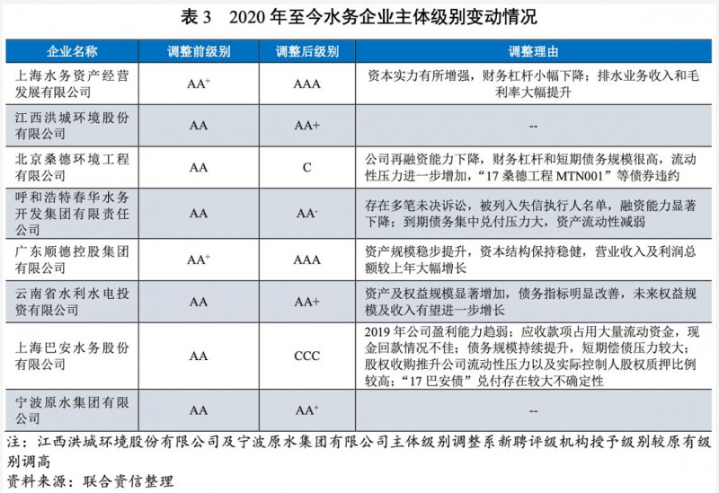 2020年以来,69家存续发债水务样本企业中有8家主体信用级别发生了变化,其中5家公司级别上调,3家公司级别下调。