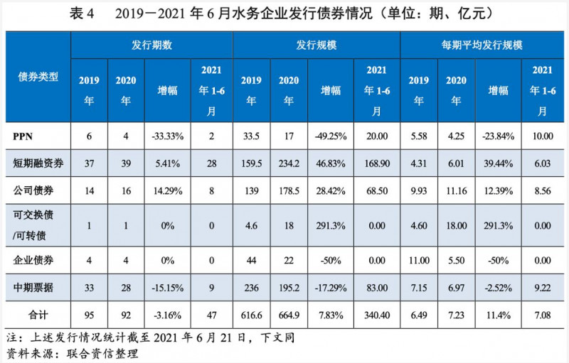 从发行品种看,2020年,水务企业发行债券品种以中期票据和短期融资券为主,合计发行数量和发行规模分别占当年发行总量的72.83%和64.58%;2021年上半年,水务企业发行品种及发行规模中短期融资券占比最大,分别占当期发行总量的59.57%和49.62%。