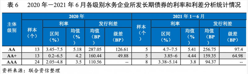 从发行利差看,水务企业债券不同级别、不同期限发行利差呈波动态势。其中,AAA主体发行利差波动较小,其他企业发行利率区间及利差波动较大,主要系水务企业样本企业偏少,市场认可度差异较为明显,不同时间段发行企业的差异对发行利率及利差影响很大。2020年及2021年1-6月,水务企业债券不同级别、不同期限发行利差详见下表。