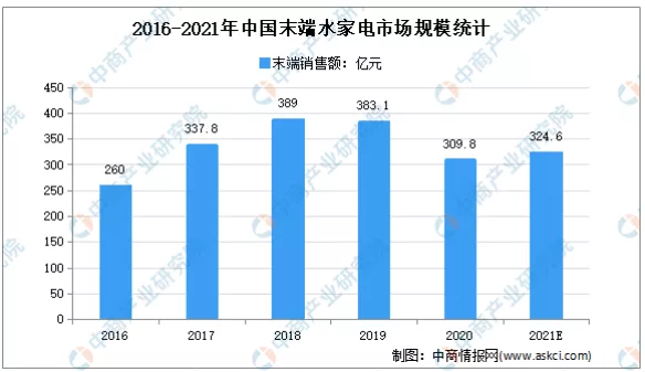 净水器市场新增需求减少,未来增长放缓,内部消费需求也出现升级。数据显示,2020年我国末端水家电市场规模达309.8亿元,同比下降19.1%。据奥维云预测,2021年我国末端水家电市场规模将达324.6亿元,同比增长4.8%。