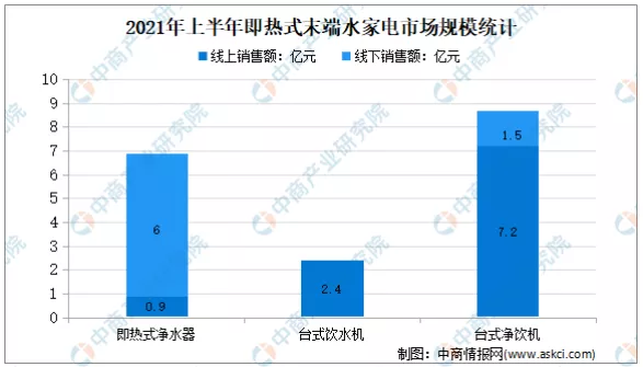 从销售渠道来看,2021年上半年即热式末端水家电线上销售中,台式饮水机及台式净饮机线上销售额占比较大,销售额分别为2.4亿元、7.2亿元。即热式净水器线下销售额占比较大,达6亿元。