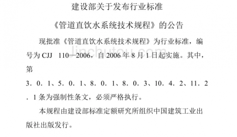 2006年8月1日,建设部发布实施了行业标准《管道直饮水系统技术规程》(编号为CJJ110-2006)。作为我国第一部针对管道直饮水的技术规程,为直饮水市场提供了一个标准依据,为市场规范提供了一个可参考的标准。
