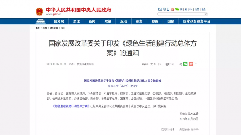 2019年10月29日,中华人民共和国国家发展和改革委员会发布《国家发展改革委关于印发<绿色生活创建行动总体方案>的通知》(发改环资〔2019〕1696号)。