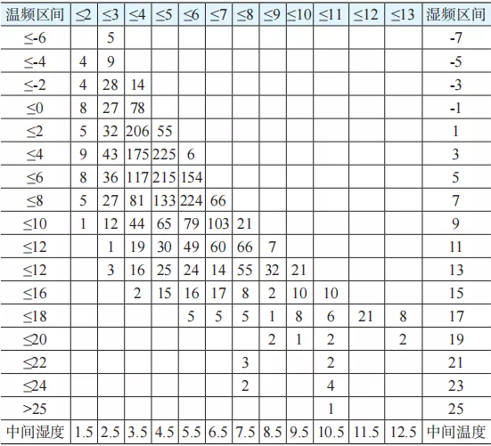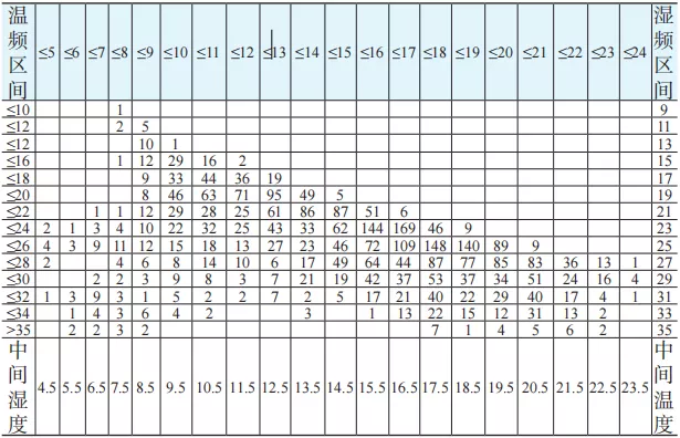 建筑能耗计算中温频法[2]早有应用,温湿频法[4]计算空调新风能耗直观准确,是简易可靠的计算工具。本文城市气象数据采用典型气候年[1]气象参数,经过数据处理形成采暖、空调季温湿频数据表,温湿度参数的频度为1小时1次,见表1、表2。