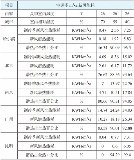 2.2 新风能耗计算新风能耗采用逐时焓差累积计算,湿空气焓值:hma=1.01t+0.001d(2501+1.85t),其中室外空气温度、湿度采用统计区间中心点参数。空调室内温湿度依据国家现行暖通空调设计规范[7]选取:夏季室内空调设计温度范围为24~28℃,计算采用26℃,相对湿度40~70%;冬季室内空调设计温度范围为18~22℃,计算采用20℃,相对湿度30~60%。