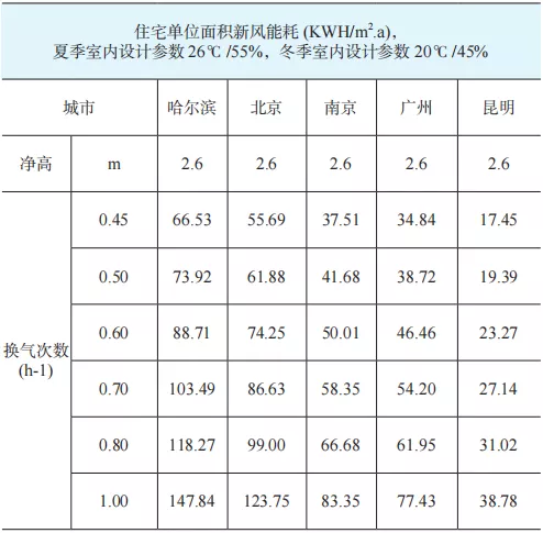 2.4 典型城市单位建筑面积(m²•a)不同换气次数能耗计算分析(见表2)