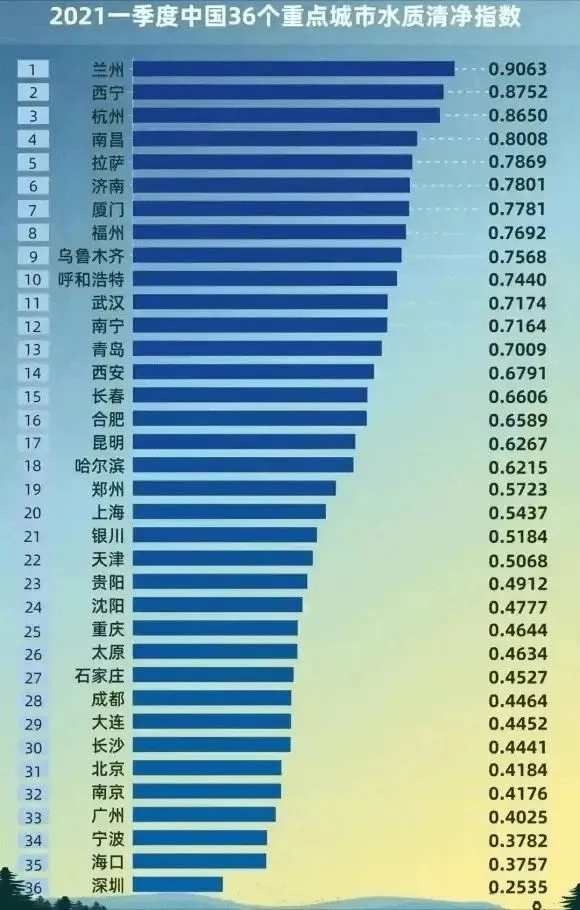 我国水资源人均占有量 图 01 什么是水质? 饮用水Ⅰ级,代表该区域的水基本没受过污染,可达到直接饮用的水平。在我国Ⅰ级饮用水主要分布在国家级自然保护区内,许多饮用水企业取水地水质已达到了饮水Ⅰ级水平,比如长白山(吉林省)、万绿湖(广东省)等地。这些地区虽处于发达地区,但这些水源地都早早被保护起来,水质就有了一定的保障。贵州的武陵山和四川的峨眉山、新疆天山等地的水资源也十分优质,位居饮用水Ⅰ级水平宝座。 长白山清澈的湖水 饮用水Ⅱ级则是水质良好,但水中有少量杂质,经过简单过滤可与饮用水一级相"媲美"。它与Ⅰ级饮用水的区别就在于有无杂质。这种水划分更多倾向物理层面中的透明度,水中含有的杂质影响了水的透明度,致使它滑落到Ⅱ级水平。饮用水Ⅱ级的水多分布于欠发达地区,比如在广西、云南、贵州等地大部分山区泉水就属于饮用水Ⅱ级水平。因为这些水源地没有受到工业污染,植被覆盖率又很高,水的自净能力也比较强,水质比其他地方更好一些。但美中不足的是,水中杂质多,不经过过滤,无法正常饮用。 山区泉水 图 饮用水Ⅲ类,虽归为饮用水类别,但这类水基本不能饮用。经过过滤和清洁处理后,饮用水Ⅲ类只能用于普通的工业用水。多分布在饮用水地表水源地二级保护区,这类水源主要不同点在于它有含有大量杂质,水体有轻微的异味,或是水中含有大量金属元素,人不能直接饮用。这类水之所以有异味,多是水体富营养化,水中氮、磷营养物质的富集,导致藻类和其他浮游生物快速繁殖。这样水中其它生物缺少栖息地,导致鱼虾类生物死亡,破坏了水内生态平衡,最后水散发阵阵恶臭。 湖水富营养化后漂浮的死鱼 下面我们来简单说说污水的划分,污水类的也是三个类别。 污水类的水多用于农业灌溉和做景观水,也有一部分是无用脏水。IV类污水一般是农业用水。农业用水最大的污染源来自农药和化肥,这需要很长时间的雨水循环才能逐渐消除这些有害物质。V类污水一般是景观用水。景观用水,面临的更多是受物理方面的影响,比如观光者的垃圾,或是周边树木的落叶。当然除了这些,还有可能受到污水困扰。这类水的作用就是起到观赏的作用。最后一类,是劣V类污水,这类污水属于无用脏水。 总体上来说,我国良好水质分布仍然和其他资源一样——分布不均,且水质良好的地方多数呈点状分布。从生态方面讲,南方水质偏好,北方略差。而由于东部地区经济发展较快,优质问题很严重,另一方面河流多发源于西部地区,沿途必然有污水排入河流,水质也会受到影响。 02 哪个地方水质最优? 了解了水质的知识后,那我们来探讨一下:全国水质排名情况是怎样的呢?如果是拿各个地区的水质作比较,需要综合各方面来看。许多人误认为我国水质最好的地方应该在西藏和青海地区。但其实不然,西藏和青海位于我国内陆地区而且海拔高,阻挡了湿润的季风,故而降水稀少。当地的水都来源于高山冰雪的融化,这些水里富含矿物成分,不符合我国的优质水划分标准。那么到底是哪里才是水质最好的城市呢? 青藏高原 图 今年6月21日,全国生态环境部门发布了全国地表水环境质量情况。这次排名是在全国366个地级以上城市中来评选的,最后评选出全国排名前30。 其中位居榜首的是嘉峪关市,该市不仅在地表水环境质量情况中排名第一,而且在36个重点城市水质清净指数中也位列榜首。这可以说是市级优质水中的王者了。 地表水环境质量排名前30排名(部分截图) 如果省份要排名的话,广西肯定是不得不提的,广西可谓是"金牌"拿到手软,已经蝉联冠军数年。从图中可以看出,水质前10的城市名单里,广西占了6个,在前30名中广西占到三分之一。 在这方面还不得不羡慕广西得天独厚的条件,但更多也离不开广西人民的努力。尤其是柳州作为西南工业重镇,也是广西工业的支柱,占广西的总工业的四分之一。尽管工业发展良好,当地生态环境仍然没有遭到大幅破坏,反而在全国水质排名中遥遥领先。 广西迷人的风光 另外,最近还出现了36个重点城市水质清净指数排行榜。这是2021年第一季度的数据。兰州、西宁、杭州位居前三。曾有许多网友质疑兰州水质清净指数第一。 其实,这个排名仅仅是在31个省会和其他5个市一起排名的。再说,在336个城市中水质排名中兰州也榜上有名。兰州水质改善的重要原因就是新型水源地的建成与运行,目前大多数民众都已经用上了新水源地输送的水。另一方面,近年来水源地得到很好的保护,水质改善是必然的。 2021第一季度水质清洁排名图 那这些数据是怎样得来的呢? 这些数据都来源于水质监测得出的结论。工作人员在水源地或河流进行取样调查,然后对采样的水进行分型对比,从水的硬度、PH值、纯净度等方面进行归类,把水分为六个等级。 03 保障水质的重要意义 水是生命之源,可以说没有水就没有生命体。人体的70%都是水,它对生命的重要性不言而喻。其实,很多人认为地球应该叫"水球",这种说法确实可是有理有据的。在总面积中,海洋占据了地球的大约三分之二的面积,陆地仅仅占到总面积的三分之一。 或许人有会说,那天天嚷嚷着节约水资源,难道是杞人忧天,在做无用功吗?还真不是。地球上的水有咸水和淡水之分。其中淡水才占总体水量的百分之三,其中的大部分是冰帽和冰川以及地下水,