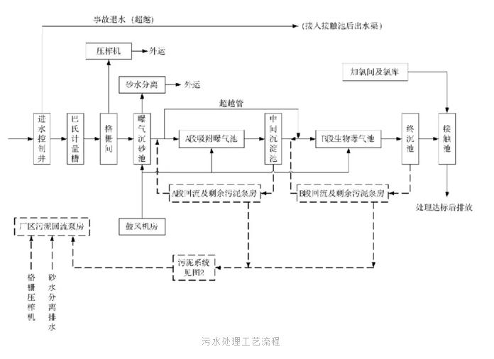 原污水处理厂设计规模共40万m3/d,污水处理工艺为AB两段活性污泥法,污水处理工艺流程如图所示。