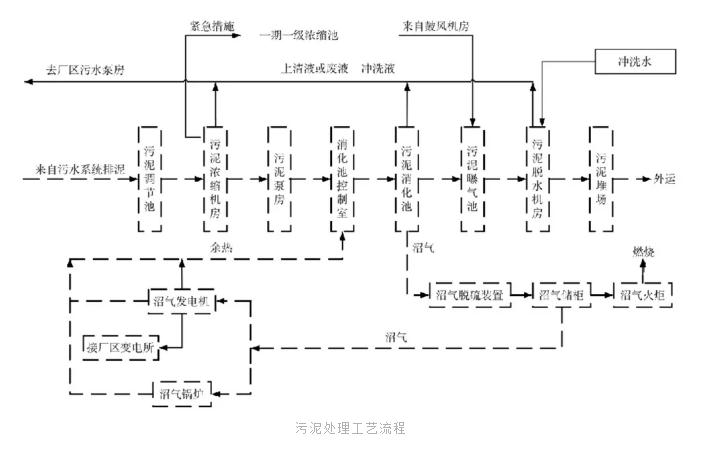 污泥处理采用机械浓缩、一级中温消化、机械脱水方案,沼气用于沼气发电机.html'>电机及燃气锅炉,通过沼气储柜调节储气量后,多余沼气自动点燃沼气火炬在大气中燃烧,污泥处理工艺流程如图所示。