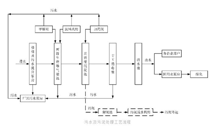 甲醇储存系统:设置2个90 m3甲醇储罐,可储存6 d用量,甲醇储罐设置在全地埋钢筋混凝土池内,池中填砂,池内设集水井并配置液位监测仪,可监测甲醇储罐泄漏。