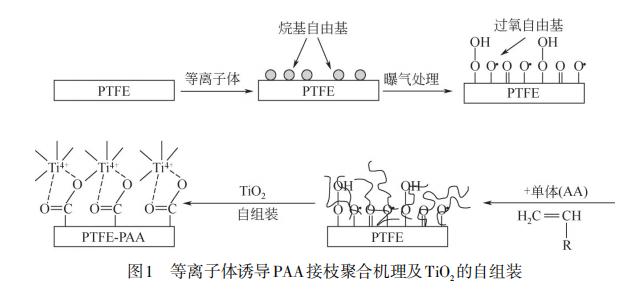 对膜材料进行物理和化学改性,利用特定基团与TiO2形成共价键或氢键实现TiO2稳定负载。Zhou等利用聚多巴胺(PDA)的邻二苯酚官能团和TiO2的螯合作用,对聚偏氟乙烯(PVDF)膜进行改性,采用物理共混法制备了 PVDF-PVP-TiO2-DA(PPTD)改性超滤膜。PDA涂层的黏合、活性吸附与电子传递作用使磺酸嘧啶 (SD) 吸附在膜表面,强化了光生载流子的转移,提高了TiO2的光催化活性。TiO2-PDA 的协同作用加速了磺酸嘧啶 (SD)的光催化降解,经 PPTD 膜过滤-光催化系统处理的水中未检测到N、F和Ti,证明该膜和光催化剂稳定结合。在 PVDF或聚四氟乙烯 (PTFE)超滤膜上通过等离子体诱导接枝聚丙烯酸 (PAA),利用羧基与Ti4+的螯合配位作用成功固定了TiO2光催化剂,见图 1。制备的复合膜具有较高的水通量、较好的过滤性能和自清洁能力,经30min紫外线照射后,通量可100%恢复。