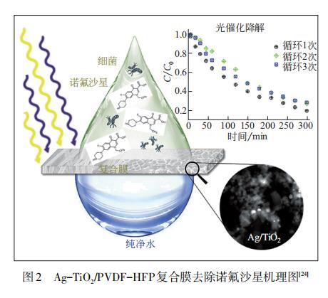 Shareef等采用浸涂法在中空纤维陶瓷膜上固定Ag-TiO2纳米光催化剂,Wang等采用相转化法制备了Fe-TiO2/PSF复合超滤膜,银纳米粒子掺杂取代TiO2晶格中的Ti4+,使TiO2的吸收波长扩大到可见光范围并降低电子和空穴的复合率,因此,提升了双酚 A 光催化降解性能。Salazar 等用 Ag 对TiO2进行功能化处理,通过溶剂浇铸法和电纺法制备了基于聚偏氟乙烯-六氟丙烯 (PVDF-HFP) 的复合膜,可以有效去除诺氟沙星,并且具有良好的抗菌特性,避免了膜污染,延长了其使用寿命,见图2。掺杂在TiO2晶格中的非金属通常包括N、S、 C和其他非金属单体或其化合物,其中,以二维纳米碳材料氧化石墨烯或非金属元素N掺杂TiO2的超滤膜研究最为广泛。Liu等采用真空抽滤法在乙酸纤维素 (CA) 膜上制备了新型的 TiO2纳米棒石墨烯基薄膜,嵌入的TiO2纳米棒可扩大石墨烯层间的间距,提高膜分离效率,对亚甲基蓝 (MB)、罗丹明 B (RhB)、甲基橙 (MO)、分散蓝 (CR)的截留率均在 99% 以上。Kamaludin 等[27]合成了在可见光下具有优异光催化活性的 N 掺杂 TiO2材料(N-TiO2),通过干湿共纺技术制备了可见光驱动光催化双层中空纤维PVDF膜,即使在弱光照下也具有高效的光催化降解活性,且不会在水中留下任何光催化剂。