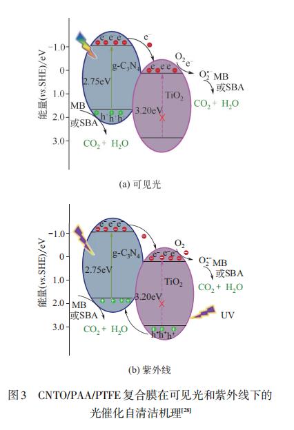 为提高复合膜的光催化性能,Li等通过将块状g-C3N4剥离成纳米片,提高了光生电荷的密度和迁移率,在聚丙烯腈(PAN)多孔基底上抽滤,制备出在可见光下具有自清洁和抗菌性能的复合膜。
