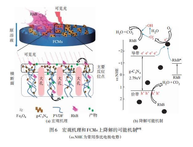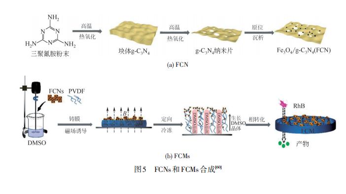 可通过掺杂、剥离和构筑异质结等方法有效解决块状g-C3N4存在的比表面积小且光生载流子的复合速率快等问题。Zhang等采用相转化法将Ag改性石墨碳氮化物 (Ag/g-C3N4) 引入PES 膜,提高了复合膜的亲水性和渗透性能,在可见光照射下具有良好的抗菌、光催化和抗污染性能。Hu 等[57]制备了磷掺杂的 g-C3N4 (PCN),磷掺杂可以填补碳空位,修复结构缺陷,减少载流子复合,提高光催化活性,与无机Al2O3中空纤维膜组件集成并用作光催化膜反应器。Yang 等[58]利用介孔石墨氮化碳(MCN) 光催化剂与PVDF膜进行共混,增大MCN量可提高膜的亲水性。为改善g-C3N4在膜基质中的分布和功能,Salim 等[59]在 PES 浇铸液中加入亲水性表面改性高分子 (LSMM) 与含氧石墨氮化碳(OGCN),LSMM 可促进 OGCN 向膜表面迁移,提高光催化活性。Li等提出了一种磁诱导冷冻铸造方法来制备高效大孔Fe3O4/g-C3N4/PVDF 膜 (FCMs)(见图5),将磁性Fe3O4/g-C3N4定向高暴露于膜表面,形成有序的大孔结构,增加了膜表面光催化活性位点,大孔结构有利于光的穿透,FCMs对可见光的吸收明显增强,具有良好的渗透性和循环使用性,见图6。