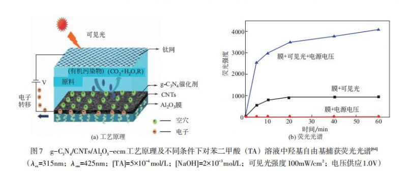 为进一步提高g-C3N4纳米片光催化效率,Wang等采用高导电性碳纳米管 (CNTs) 可见光响应的g-C3N4,制备了g-C3N4/CNTs/Al2O3膜。在碳纳米管层上施加正电压,可见光辐照的g-C3N4层中的光生电子可以被抽离并从空穴中分离出来,使膜具有光电催化功能,解决了光生电子空穴的快速复合和微弱的可见光响应问题,见图7。Zhao等[3]以还原氧化石墨烯 (rGO) 为电子受体,将 g-C3N4纳米片和rGO光催化剂组装在商用CA膜表面,g-C3N4与rGO之间的异质结构会促进光生电荷分离,增强光催化效率。虽然二维(2D)石墨烯纳米片构建的皱褶层状结构的水传输通道具有良好的分离效果,但有效地调节其层间距仍是一个挑战。Wei等制备了一维石墨氮化碳纳米管 (g-C3N4NT) 插层 rGO 纳滤膜,g-C3N4NT光催化剂可以增大rGO的层间距,提高膜的水通量。Zhang 等构建了一种由 g-C3N4、TiO2、CNTs 和氧化石墨烯 (GO) 组装而成的光辅助多功能纳滤膜(图7),不仅扩展了相邻石墨烯片之间的层间距,增强了GO层的稳定性和强度,而 且g-C3N4和TiO2形成的异质结产生了丰富的光生电荷。该纳滤膜显示出高水通量[16L/(m2·h·bar)],并保持了较高的染料截留率 (甲基橙为100%) 和。 盐截留率(Na2SO4为67%),对水中氨氮、抗生素和BPA具有良好的去除效果,分别为50%、80%和82%。