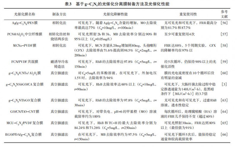 总体而言,目前g-C3N4基光催化膜的研究主要集中在g-C3N4光催化剂的开发上,探索光催化剂和膜基底之间紧密结合的研究较少,大部分通过真空抽滤法制备,存在光催化剂易流失等问题。因此,亟待深入研究高稳定性g-C3N4基光催化膜的制备方法。基于g-C3N4的光催化分离膜制备方法及光催化性能见表3。