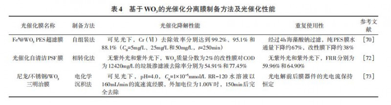 WO3 还可以抑制微生物在膜表面的生长,Sathya 等以果胶为共混添加剂,以 WO3为抗菌剂,采用相转化法制备了聚醚酰亚胺复合平板膜,并用于纺织废水处理。在半导体光催化剂上施加电位可以提高光催化效率,光电催化过程使光生电荷更好地分离,Martins等研究了尼龙纤维和不锈钢网组成的新型夹心膜,通过在不锈钢网上电沉积WO3,由于过滤、吸附和光电过程的协同作用,三明治膜在废水光电催化处理中表现出良好的性能。膜过滤与光电催化相结合,实现了纺织染料活性红(RR-120)的高效去除。基于WO3的光催化分离膜制备方法及光催化性能见表4。