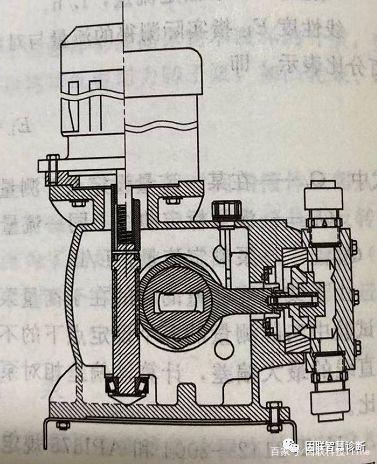 液压隔膜式计量泵是工业生产中应用最广泛的计量泵。液压隔膜式计量泵通常称隔膜计量泵,图3所示为单隔膜计量泵,在柱塞前端装有一层隔膜(柱塞与隔膜不接触),将液力端分隔成输液腔和液压腔。输液腔连接泵吸入、排出阀,液压腔内充满液压油(轻质油),并与泵体上端的液压油箱(补油箱)相通。当柱塞前后移动时,通过液压油将压力传给隔膜并使之前后挠曲变形引起容积的变化,起到输送液体的作用及满足精确计量的要求。