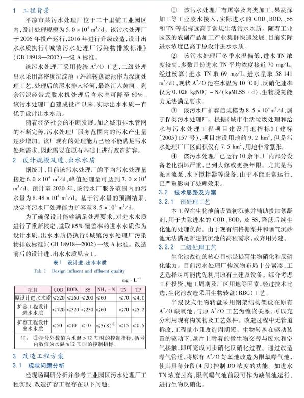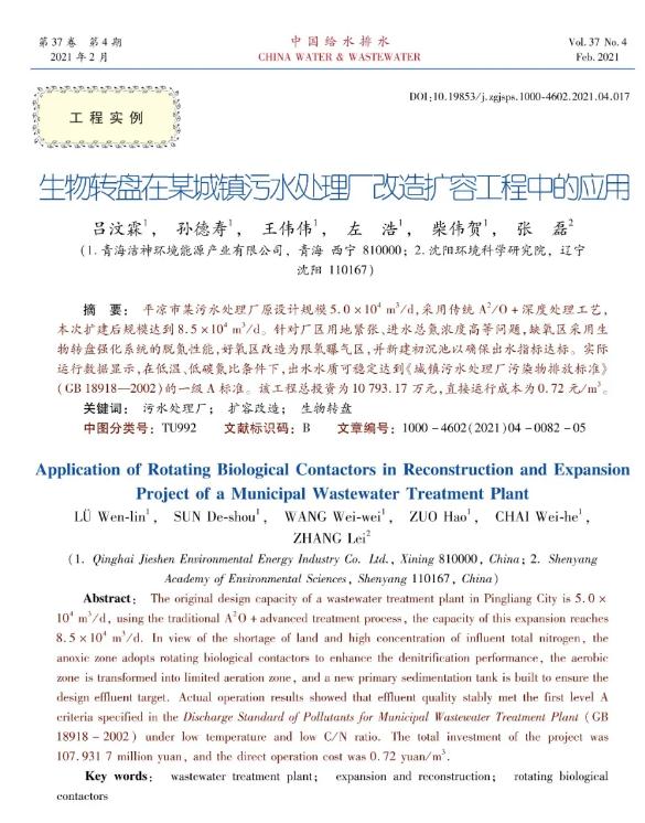 北极星水处理网讯:摘要:平凉市某污水处理厂原设计规模5.0×104m3/d,采用传统A2/O+深度处理工艺,本次扩建后规模达到8.5×104m3/d。针对厂区用地紧张、进水总氮浓度高等问题,缺氧区采用生物转盘强化系统的脱氮性能,好氧区改造为限氧曝气区,并新建初沉池以确保出水指标达标。实际运行数据显示,在低温、低碳氮比条件下,出水水质可稳定达到《城镇污水处理厂污染物排放标准》(GB 18918—2002)的一级A标准。该工程总投资为10 793.17万元,直接运行成本为0.72元/m3。