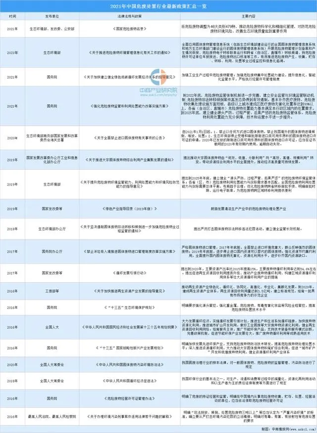 危废处置属于生态环境治理范畴,是绿色经济的重要组成部分,行业具有较明显的政策引导性特点,即环保法规体系越健全、环保执法越严格的国家,危废处置行业也就越发达。国务院与相关部门颁布了一系列产业政策,支持和推动行业发展,主要如下: