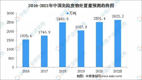 我国大、中城市工业危险废物处置量从2016年的1535.4万吨增长至2020年的2501.4万吨,年均复合增长率达12.98%,预计2021年,危废处置量将达到2623.2万吨。环保趋于严格,危险废物处理和资源化利用行业技术水平不断提高,中国危险废物处理市场将越发广阔。