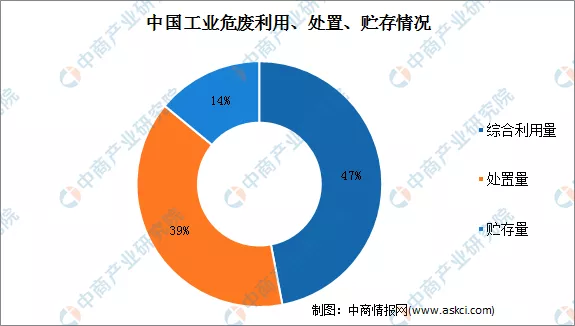 工业危险废物综合利用量占利用处置及贮存总量的47.2%,处置量、贮存量分别占比38.5%和14.3%,综合利用和处置是处理工业危险废物的主要途径,部分城市对历史堆存的危险废物进行了有效的利用和处置。