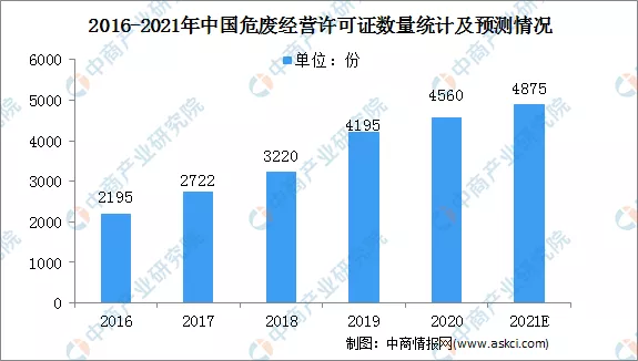 近年来,我国危险废物处置企业数量增长较快,截至2019年末,国家共颁发危险废物(含医疗废物)经营许可证4,195份,同比增长30.28%;全国危险废物(含医疗废物)经营单位核准收集和利用处置能力合计12,896万吨/年(含收集能力1,826万吨/年),平均每份经营许可证核准的业务规模仅为3.07万吨/年。