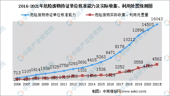 相比2006年,2019年危险废物持证单位核准收集和利用处置能力、危险废物实际收集和利用处置量分别增长1709%和1098%,整体处于增长趋势。预计危废持证单位核准能力将在2021年达到16043万吨,危废实际收集、利用处置量将在2021年达4562万吨。