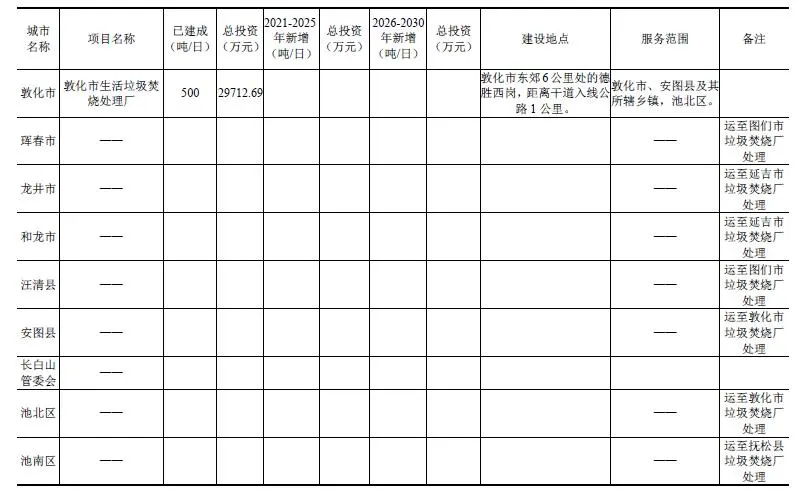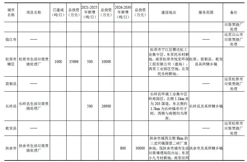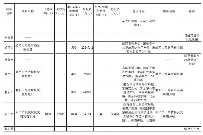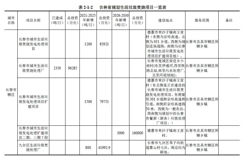 2021年-2030年,全省新建、扩建生活垃圾焚烧处理厂32座,新增生活垃圾焚烧处理能力20950吨/日,全省生活垃圾全部实现焚烧处理,形成基本覆盖全省的生活垃圾焚烧处理网络。见表2-1-2。