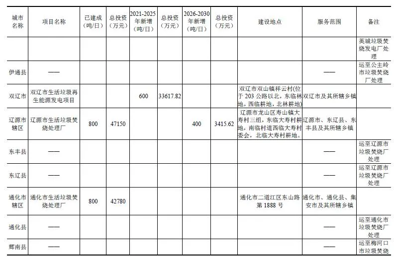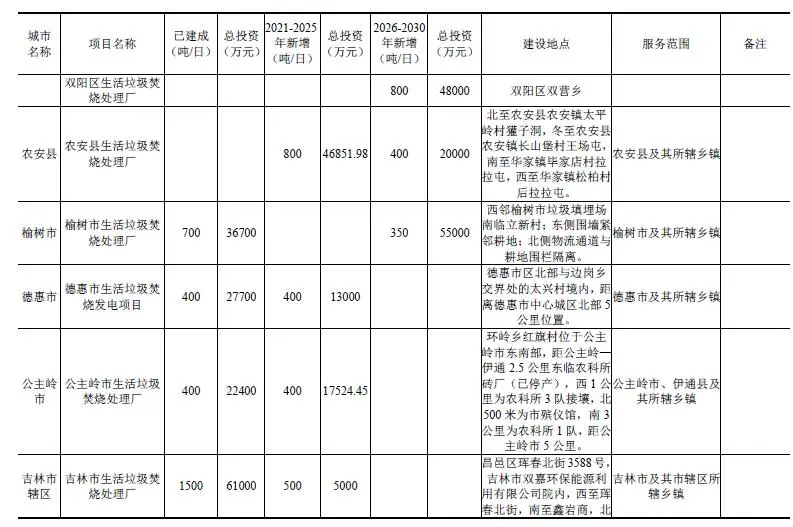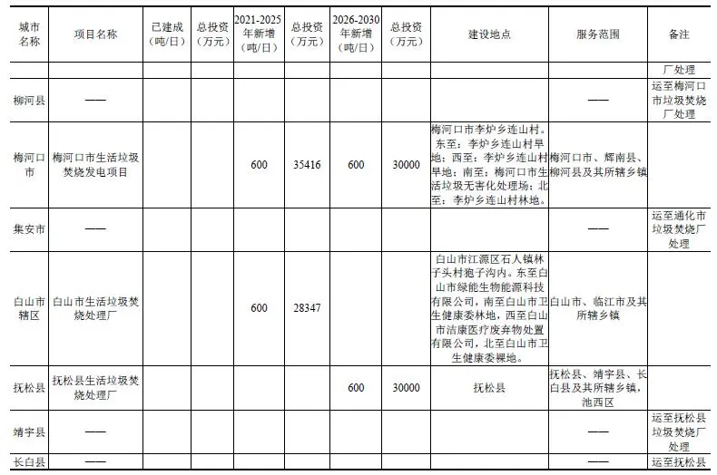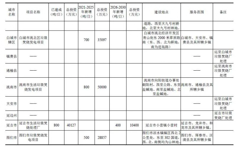 2026~2030年,全省新增生活垃圾焚烧发电设施处理能力7850吨/日。到2030年底,全省生活垃圾焚烧发电处理能力达到31200吨/日,全省生活垃圾全部实现焚烧处理。