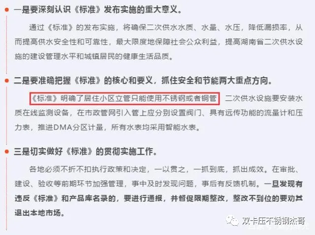 2021年04月长沙《湖南省城镇二次供水设施技术标准》中明确了居住小区立管只能使用不锈钢管或者铜管。