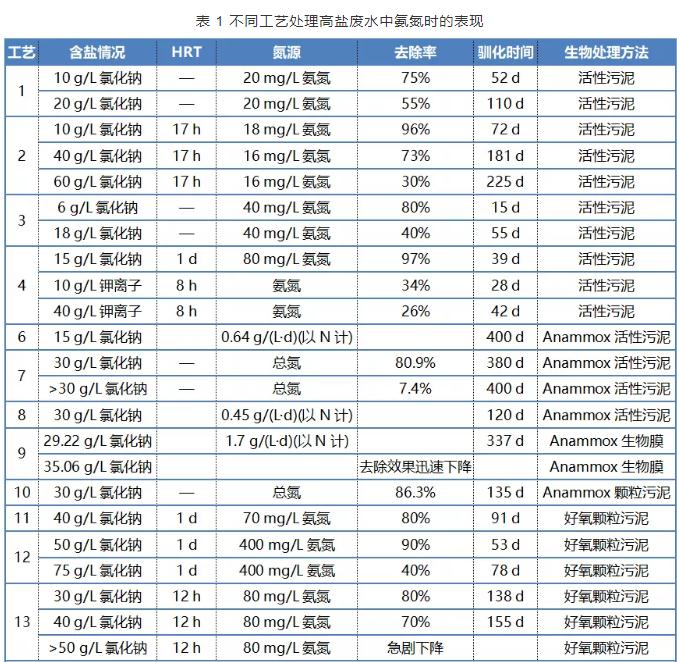 不同工艺处理高盐废水中氨氮时的表现见表 1。