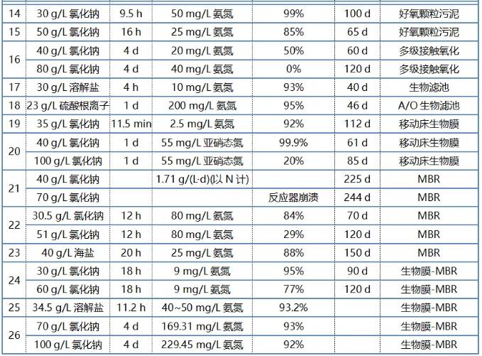 Chengliang Liu等在上流式固定床中形成Anammox生物膜对氨氮进行处理,由于菌种比较单一,其在35.06 g/L盐度下去除效果迅速下降,而普通的生物膜工艺(序号11~15)在50 g/L才会出现这种情况。