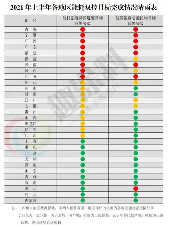 国家发展改革委印发的《2021年上半年各地区能耗双控目标完成情况晴雨表》显示,在能耗强度降低方面,青海、宁夏、广西、广东、福建、新疆、云南、陕西、江苏9个省(区)上半年能耗强度不降反升,被列为红色的一级预警;在能源消费总量控制方面,青海、宁夏、广西、广东、福建、云南、江苏、湖北8个省(区)被列为红色的一级预警。