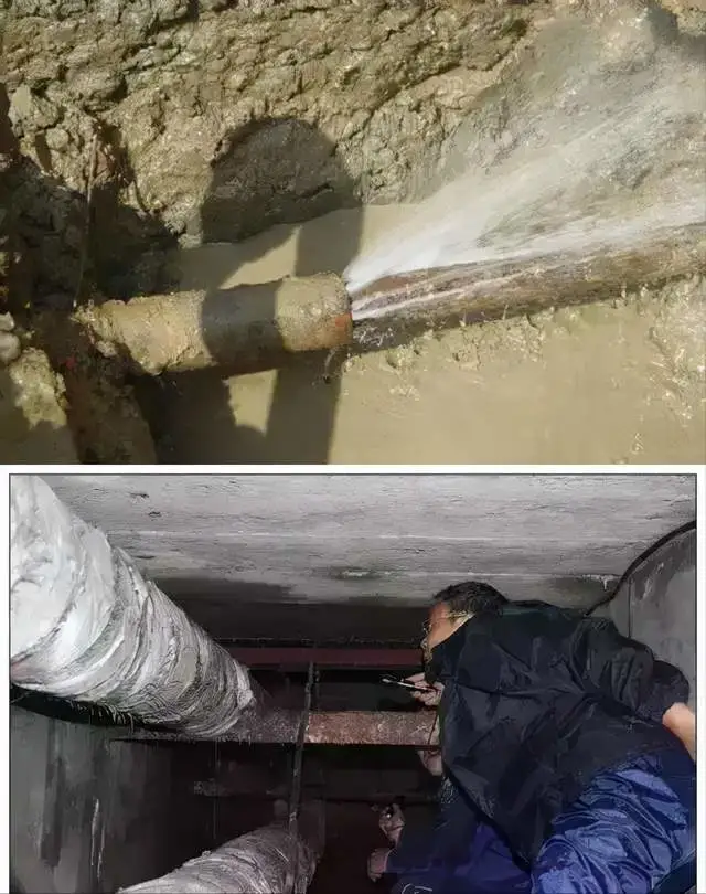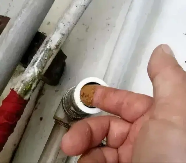 只是没想到,当工作人员打开水表房的水管,大吃一惊。水管内壁沾满了厚厚的水垢。另一根水管外壁缠着袋子堵漏水点,漏水点处还能清晰地看到青苔。