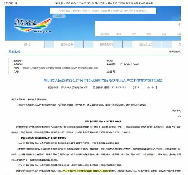 2013年5月21日,深圳市政府办公厅颁发了《关于印发深圳市优质饮用水入户工程实施方案的通知》(深府办[2013]17号),全市将分两个阶段实施优质饮用水入户工程。