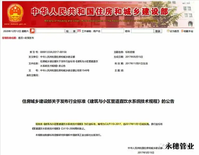2017年5月15日,中国住房和城乡建设部发布行业标准《建筑与小区管道直饮水系统技术规程》(编号为CJJ/T110-2017),自2017年11月1日起实施。特别规定:管材应选用不锈钢管、铜管等符合食品级要求的优质管材。原行业标准《管道直饮水系统技术规程CJJ110-2006同时废止。