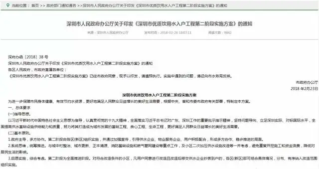 2018年3月26日,深圳市政府办公厅印发《深圳市优质饮用水入户工程第二阶段实施方案》(深府办函〔2018〕38 号)。