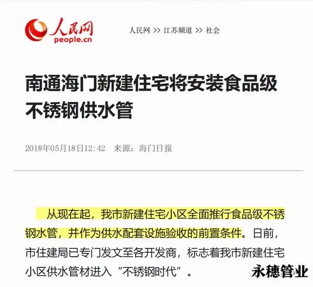 2018年5月18日,江苏省海门市住房和城乡建设局出台文件《关于在新建住宅小区推广使用食品级不锈钢管材的通知》。